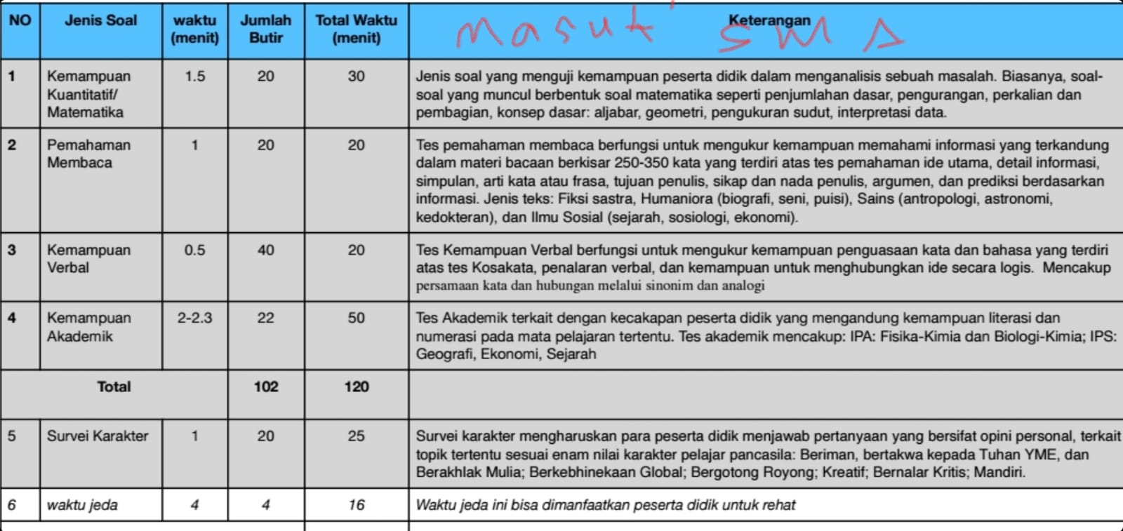 BERIKUT INI ADALAH KISI – KISI, JUMLAH SOAL DAN DURASI UJIAN SARINGAN MASUK SMP DAN SMA LABSCHOOL ;